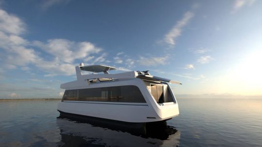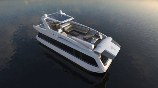 Visually, the Overblue 44 may be striking with its rectangular shape, which gives the impression of a floating block, but it is a very clever boat. The front of the boat is quite unusual, but it houses a large master cabin, with its own bathroom, balcony and large bay window. To enjoy it, you just have to raise the hood. On the same level, in the standard version, there are one or two other cabins, a large living room with dining area and kitchen, and a bathroom. As an option, a skipper's cabin can be integrated into the floats.
