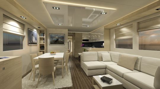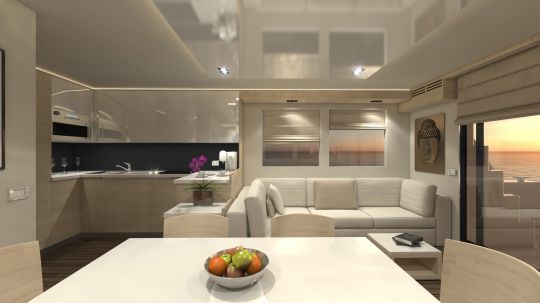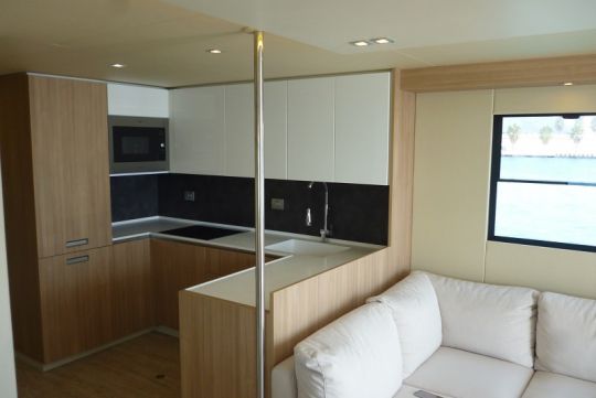 The fly is also very large since it has the same surface as the volume above the waterline. This makes it easier to maneuver, especially in port. It is accessed by steps and not by a ladder for more comfort and safety. There is a dining station, a kitchen with all the equipment (fridge, sink with hot water, grillâeuros¦). Then there is a space dedicated to sunbathing and relaxation with the cockpit. At the front of the boat, an area is reserved for the storage of the dinghy, which can be raised with a small crane.