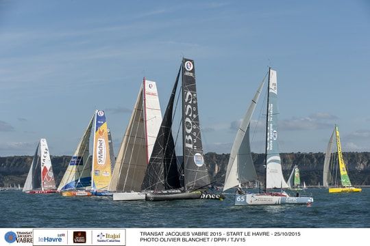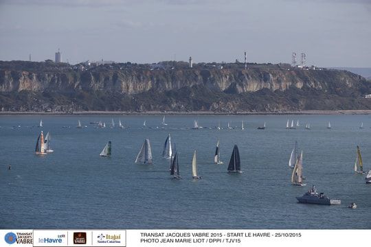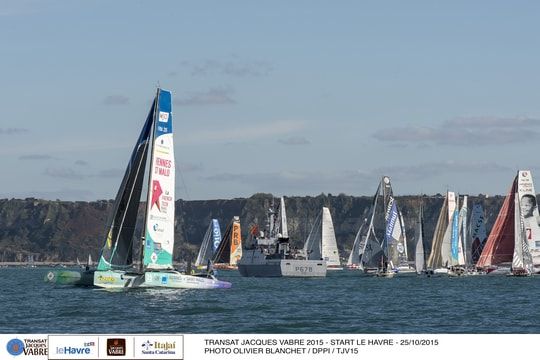 After the last goodbyes on the docks of the Paul Vatine basin, from 6 o'clock this morning, the 42 boats were on the starting line, in front of the Cap de La Hèvre, in Le Havre. On one side, the âeuro class40 and âeuro Imoca monohulls and on the other side, the âeuro Multi50 and âeuro Ultimes multihulls separated by a military boat.