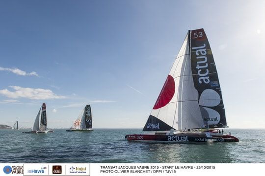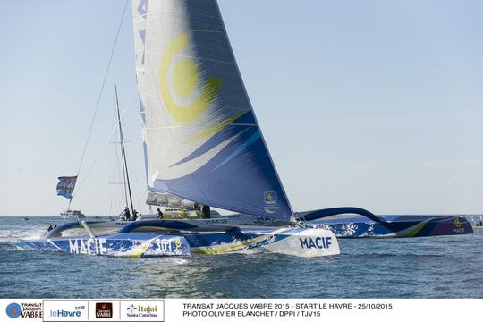 After more than an hour looking for the slightest breath of air, the wind returned from the North forcing the fleet to sail upwind to the Antifer buoy and then to the two marks anchored in front of the beach of Etretat, including the Conseil Départemental de Seine Maritime buoy, the last mark on the course before Itajaí. Macif (François Gabart/Pascal Bidegorry) then took the lead of the race ahead of Sodebo Ultim' (Thomas Coville/Jean-Luc Nélias) and Prince de Bretagne (Lionel Lemonchois/Roland Jourdain).