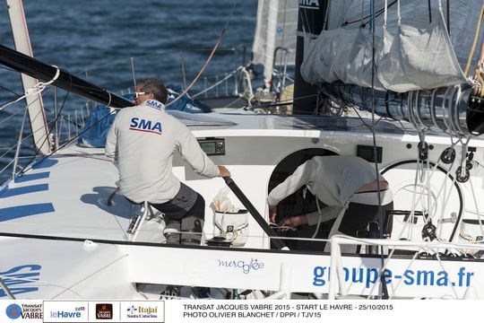 Barely 1 hour and 10 minutes after the start, SMA (Paul Meilhat and Michel Desjoyeaux) and Macif (François Gabart and Pascal Bidégorry) had taken the lead of the fleet. Even if Groupe Queguiner - Leucemie Espoir (Yann Eliès) was not far behind.