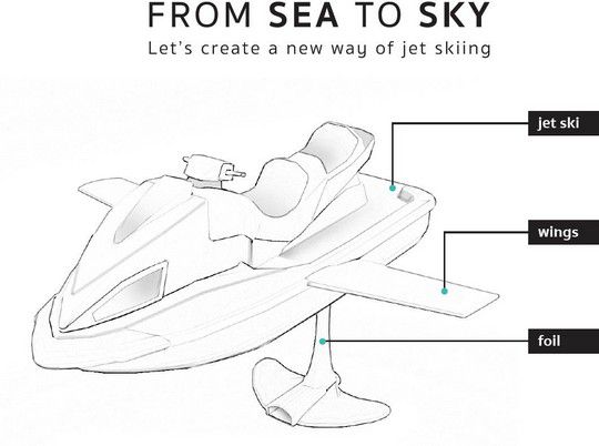 The Wataircraft will therefore be a jet-ski with wings and a tiny foil - rather considered as a jet deflector - to deflect the jet from the jet-ski which should end up in the water, about 1m lower. The device will be able to "fly" about 60 cm above the water. "You'll feel like you're flying over water cheaply, leaning to the side, making turns... " said Claudio.