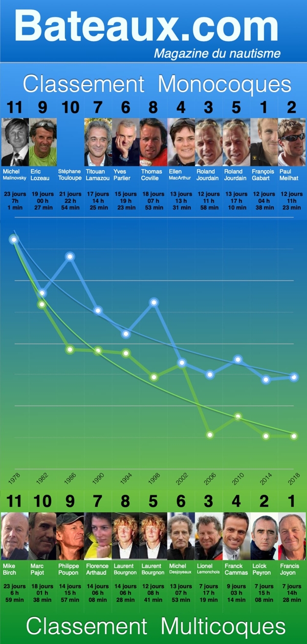 We have plotted on a spreadsheet the crossing times of Route du Rhum winners since its inception in 1978. The resulting graph shows how the reference times of Route du Rhum winners have evolved between monohulls and multihulls. Both curves have steadily declined over the past 40 years, with times divided by 2 for monohulls and by 3 for multihulls.