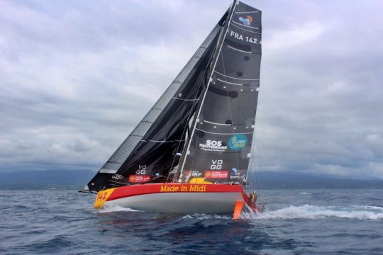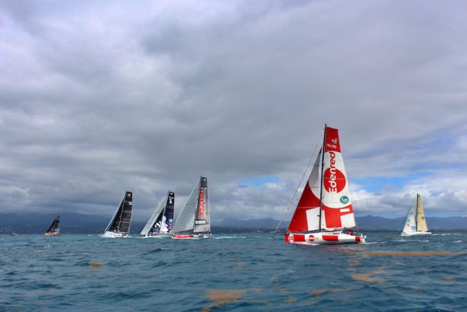 Made In Midi (Kito de Pavant and Alex Pella) was the first to cross the starting line, followed by Aïna Enfance et Avenir (Aymeric Chappellier) and Eärendil (Catherine Pourre). Campagne de France (Miranda Merron) apparently has mainsail problems and is at the back of the pack.