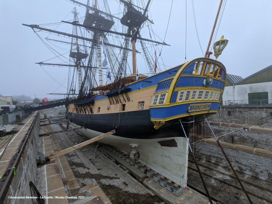 In May 2021, the Hermione's crew noticed a damage on a planking located at the rear port side. A temporary repair was carried out to allow the ship to return to the water and for the crew to prepare for a long refit. After inspection and analysis, the frigate was found to be a victim of a slow growing fungus. The extent of the damage is not yet defined, and it will be necessary to remove the planks of the sailboat on the whole of its rear part to define the extent of the work.