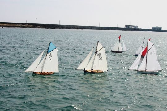 Sunday afternoon, it's a model boat regatta! The members of this club of dry-foot sailors are wise. All their boats are identical, rigged as a cutter with a boom sail. To avoid one-upmanship, the radio controls have only 2 channels. This means that the "helmsmen" can only act on the direction of their boats. They are therefore forced, before each race, to find a mean setting which allows them to sail upwind on the upwind leg, but also to sail downwind on the downwind leg without shocking the sheets! Not very purist, but very original.