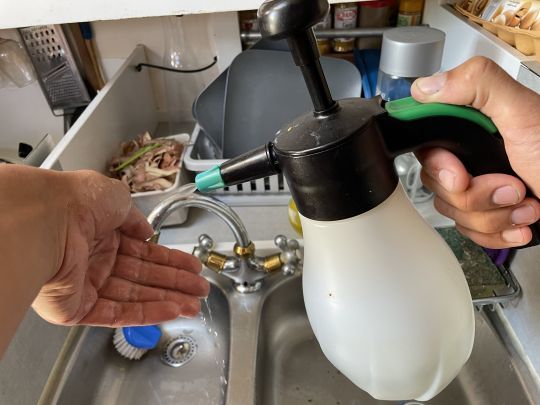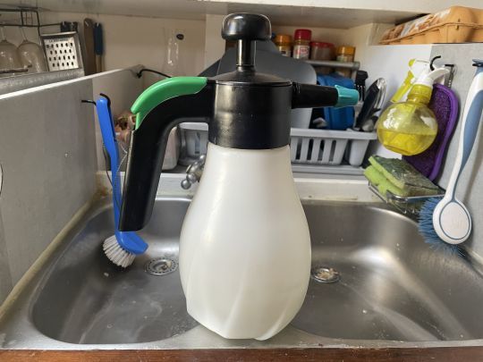 But one of the best tricks we know is the following, validated by 2 years of life on board. We use a gardening mister for washing dishes, taking showers, washing hands... The principle is very simple: a pump pressurizes the inside of the container, and a trigger is pulled to release the pressure with an adjustable nozzle, from a simple mist to a powerful jet of water.
