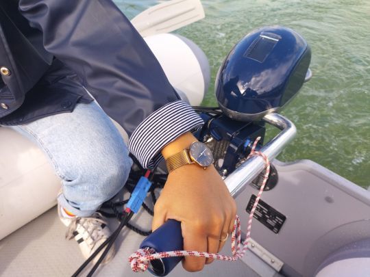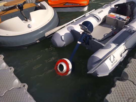 We tested the Fin5 in the basin of the Port des Minimes in La Rochelle, on a small 2.70 m Zodiac dinghy. With a power output of 2 kW, which the manufacturer compares to a 5-hp petrol outboard, the Fin5 weighs in at 20 kilos. Although this is starting to take its toll on the carrier, it remains in the transportable category, weighing 5 to 7 kilos less than its combustion-powered rivals. At the same time, you need to carry the battery, the weight of which will depend on the desired range.