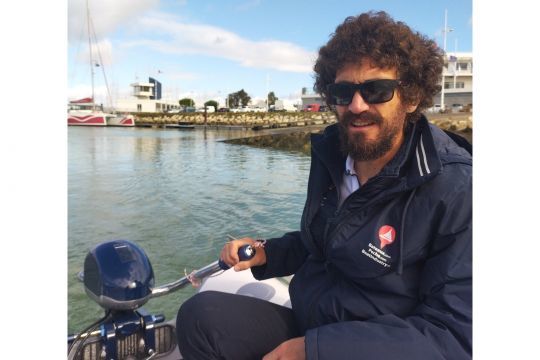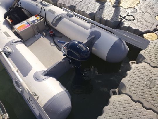 Once the magnetic key has been magnetized to the end of the tiller, it's time to cast off. The high torque of the motor, an advantage of electric power, is further enhanced by the diaphragm. The maneuver to leave the pontoon in forward gear is extremely easy, with two people on the dinghy, but can also be performed with a loaded boat returning from a race.