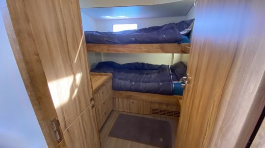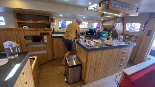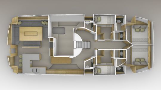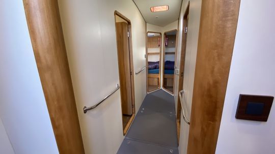 Below this huge deck are 4 double cabins and 4 washrooms. All are symmetrically distributed forward of the companionway. Moving aft, we pass the engines. These are electrically propelled, with 2 x 45 kW supported by 2 generators, each producing 50 kW. With the large lithium battery pack, the boat is completely self-sufficient.