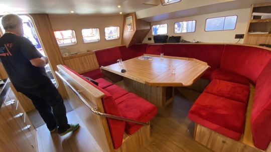 The highlight of the show is the saloon at the very rear of the boat, with its huge galley. This saloon opens directly onto the aft skirt, with a real door large enough to avoid having to bend down.