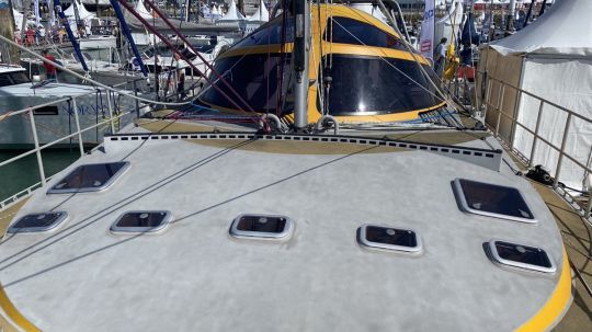 This all-aluminum sailboat makes no secret of its rugged, rough-hewn appearance. There's no room here for frills. The cockpit benches are simple slats, while the rest is covered with an industrial-style non-slip surface. A stroll around the deck is an improbable experience, so wide is it. The huge foredeck gives access to the anchor locker and sail locker.