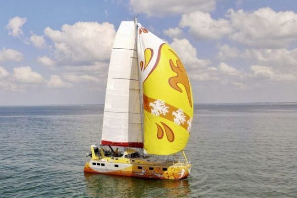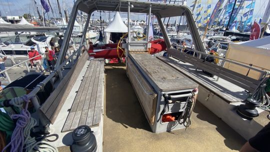 The Mirabelle 16, named after the emblematic fruit of Lorraine, is an aluminum sailboat with a scow bow. It's hard to describe the look from the pontoon. This nearly 16 m sailboat is 6 m wide from start to finish. It looks more like a barge than a cruiser racer! Below the waterline, 2 keels bring the draft up to 1.80 m, and 2 rudders are connected to hydraulic steering. Weighing in at 23 tons, it's not clear that the scow design is very relevant... Indeed, this type of hull requires very light sailboats to be efficient.