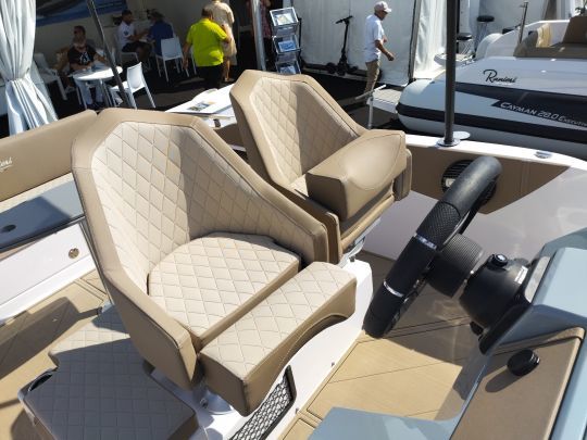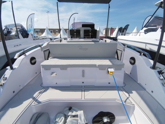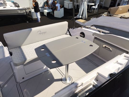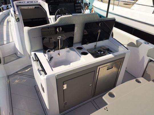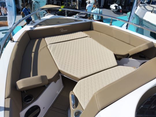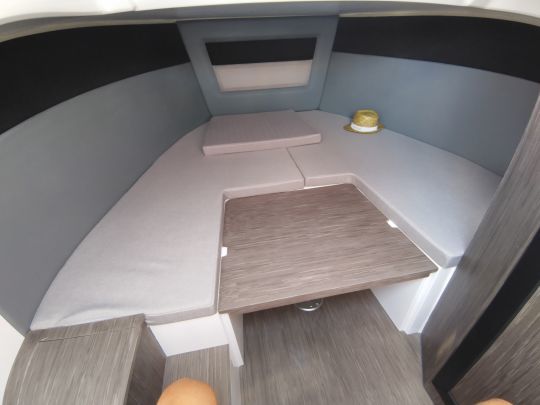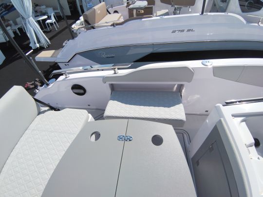 The bow is always dedicated to lounging. In walkaround configuration, the SL offers either a cockpit around a table, or a very large sunbathing area, once folded down, linking with the front console seat. The backrests can be tilted to create two loungers.