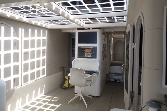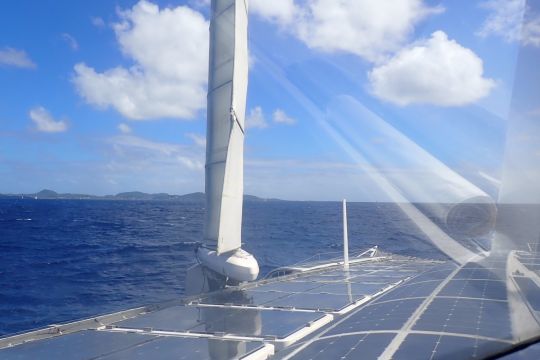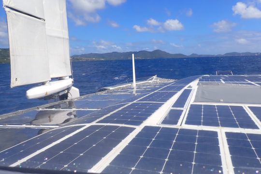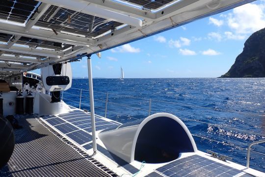 No pollutant emissions and not the slightest noise pollution, it's electrically propelled. On board, the visit will surprise the vast majority of yachtsmen. Almost everything here is unusual. The sober black cylinders set vertically on their balestrons have nothing in common with our usual masts. The entire external décor, almost exclusively based on photovoltaic cells, lends the setting an atmosphere worthy of a fictional comic strip.