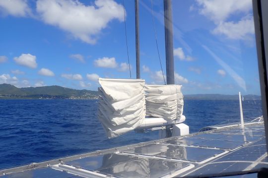 Wisely anchored in Anse d'Arlet, Martinique, the big bird is gently tugging at her crow's feet... Jibé, her intrepid and smiling captain, has come to pick us up with the big dinghy used as a tug for port maneuvers, which are always very delicate with such a unit. Anchor swiftly slipped away, the catamaran evades slowly, quietly and smoke-free, with the elegance of a ballerina.