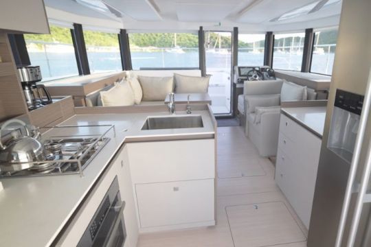 The most compact power catamaran in the Moorings range, this newcomer makes powercat sailing even more accessible, without compromising on the brand's high standards of quality and comfort. Holidaymakers will find the same high level of equipment and premium finishes that the range has offered for decades. While electric davits facilitate dinghy maneuvers at anchor, a water purifier eliminates the need for bottled water, and solar panels provide energy at anchor with complete peace of mind.