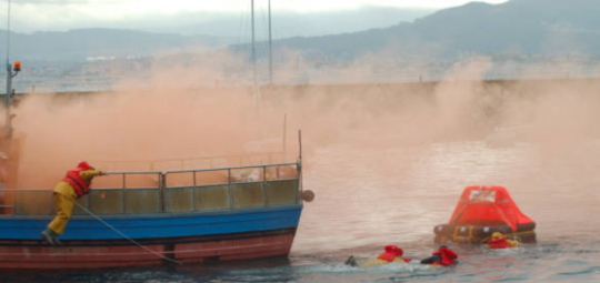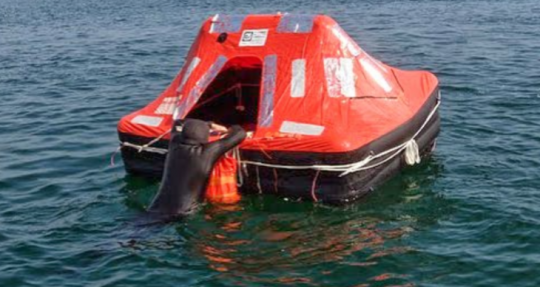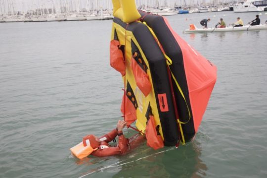 When the ship is about to sink, the crew must board the liferaft without delay. Don't forget to retrieve the watertight bag with all your survival gear. A knife without a point is attached to the liferaft near the mooring line to cut it, so as not to be swept away by the boat when it sinks. Once on board, keep your lifejacket.