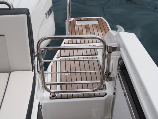 On board the Leader 9.0 WA Series 2, access is via a spacious opening on the port side, closed by a sturdy stainless steel gate. Two wide bathing platforms, which can be fitted with handrails, flank the twin outboard motors.