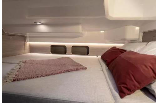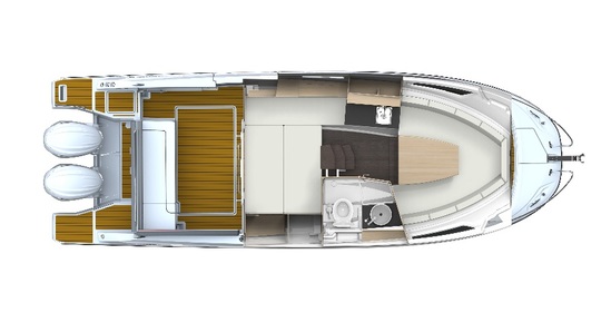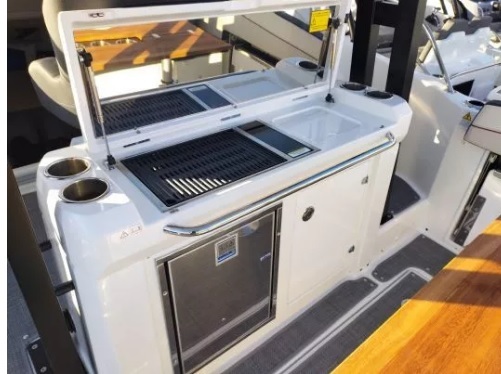 Opposite the aft dinette bench is a galley equipped with fridge, grill, hob and sink. An optional livewell can be installed for fishing enthusiasts.