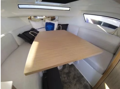At the front, the V-shaped bench converts into a double bed, after lowering the table. This dining area cannot accommodate as many guests as the outside table. It is intended to serve as a secondary dining area for a reduced crew if outdoor conditions do not permit.