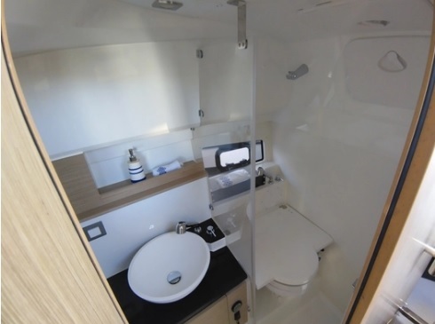 This newcomer's biggest innovation! On the port side, the tilting bulwark increases the deck area, making it easier to swim at anchor. It is operated with a hoist and cleats, and offers a small 70-centimeter balcony giving direct access to the sea.