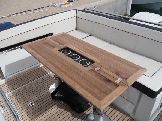 On the starboard side, an L-shaped space forms a dining area with a modular bench seat, whose fold-down back opens onto the aft platform. The table seats up to six, and faces a small bench integrated into the rail. To convert the cockpit into a sundeck, simply lower the large table and deploy the optional T-top extension for protection from the sun.