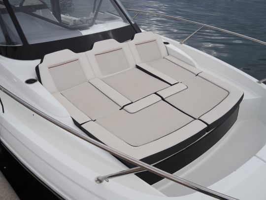 Access to the bow is best via the port side passageway, as the console is asymmetrical. In front of the helm station, a large sundeck with integrated headrests seats three.