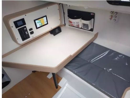 Inside, at the foot of the companionway, a large chart table is positioned on the starboard side, providing a focal point for the navigator during offshore regattas. Next to the electrical panel is a sink with a symbolic water tank in the form of a canister, easily refilled in port.