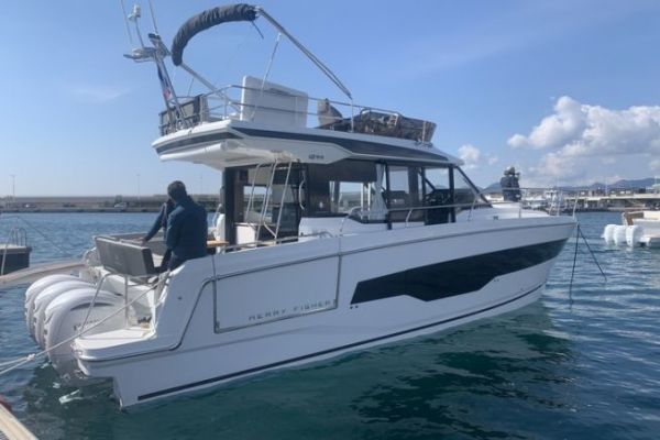 The Merry Fisher 1295 Fly is the largest unit in the Merry Fisher range, with an overall length of 12.56 m - 11.92 m hull length - and a beam of 3.80 m, for a total unpowered weight of 8,181 kg. She is fitted with three 300 hp outboards, flanked by two bathing skirts. The boat is approved in category B, and can accommodate up to 10 people.