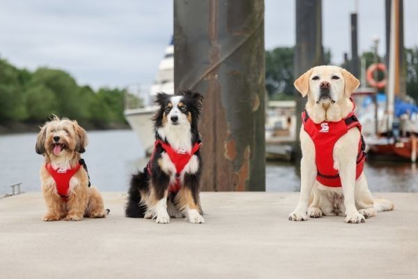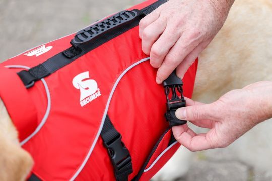 The Secudogs dog vest is equipped with an innovative four-point harness system for optimum fit to the dog's body. The vest is available in five sizes, from XS to XL. A fabric loop allows a leash to be attached, ensuring that the vest stays securely in place when walking near water, such as on docks or piers, where a dog could easily fall into the water.