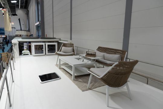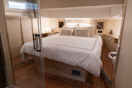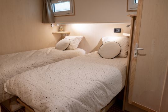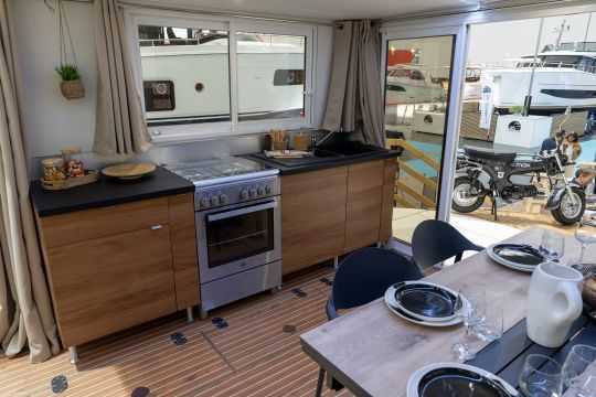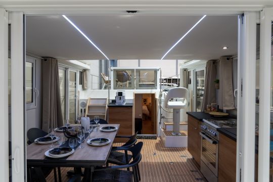 Livability is a key feature of LaPéniche eXP. Designed for all-season use, it benefits from reinforced thermal and acoustic insulation with a polyester/PVC foam sandwich structure and double glazing. Its modular layout can accommodate from one to six cabins. In terms of comfort, the equipment is worthy of a terrestrial dwelling: 40,000 BTU air conditioning and reversible heating, complete household appliances (dishwasher, washing machine, wine cellar, etc.), top-of-the-range multimedia system with Samsung The Frame TV and unlimited satellite connection via Starlink.