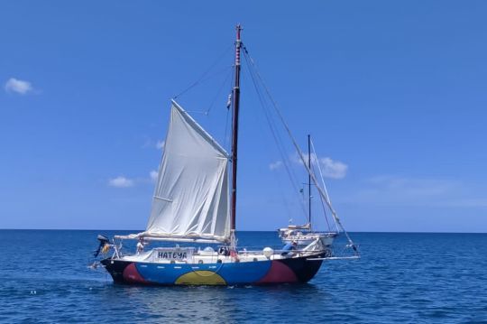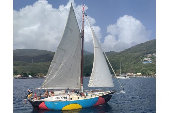 Hateya means footprint in the sand "in Amerindian. If you ever come across this sailboat, you'll remember it for the rest of your life. It's a 9.50-meter old rig, a 50-year-old auric cutter with a steel hull and wooden mast.