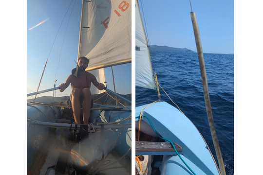 While the first week was spent in very light airs, with little or no wind, Romain was able to find his own rhythm. He admits he's never had to practice abseiling, feet in straps, let alone trapeze! He took his cousin on board for 2 days and even hitchhiked a tourist onto a beach... But for the rest, he sails his 420 alone.