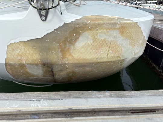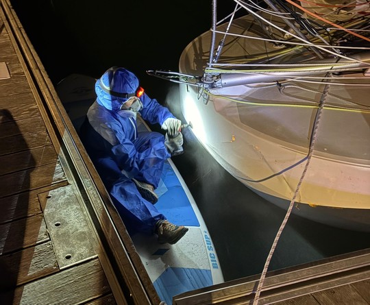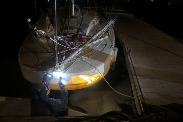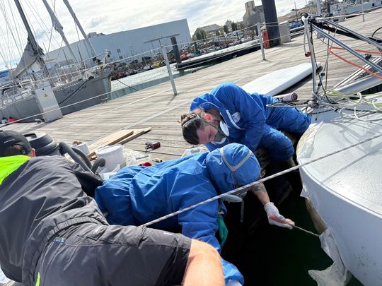 Cutting out the delaminated laminated parts, rebuilding the crash box, re-jigging, laminating and finally applying a layer of gelcoat to ensure watertightness: a real commando operation, carried out at full speed to get the boat back on schedule.