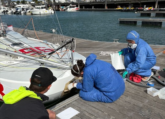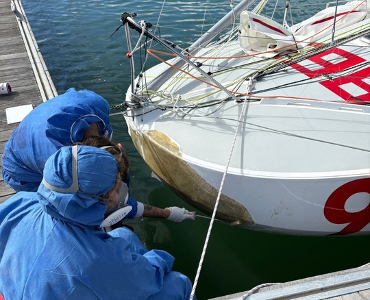 While Sophie Delannoy was able to set off again at 6.30pm, Gabriel's situation seemed more compromised. But this was without counting on the immediate mobilization of Victor Brodeur, composit boat builder at the SKAW shipyard, and Anne-Gaëlle Gourdin, who raced the last Mini. Without a moment's hesitation, they set to work at 5pm, putting in almost 24 hours of uninterrupted effort with barely 30 minutes' sleep.
