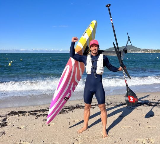 At the age of 32, Tom Constant has just achieved an outstanding performance in the world of foiling. Setting off at dawn from Palavas-les-Flots, he reached the Almanarre beach in Hyères after 7 hours 37 minutes of continuous effort, carried solely by the swell and the power of his legs.
