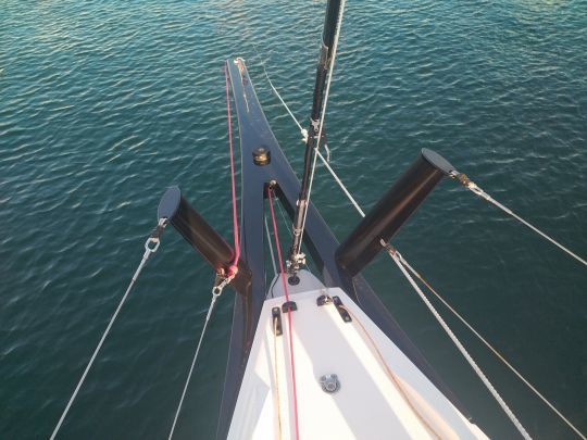 The XR 41 has a modern, taut and powerful hull. The inverted stem, full forward volumes and V-shaped transom reflect a quest for balance between speed and stability. The Axxon Composites High Modulus carbon mast is positioned far back, optimizing sail area and weight distribution.