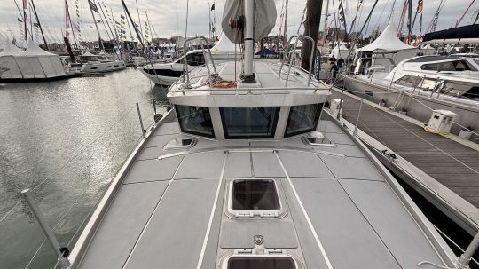 The roof is designed to accommodate up to 2,000 W of solar panels. The system is designed for maximum autonomy during extended sailing. However, on this first model, the panels are installed on the aft gantry, leaving the deckhouse uninstalled. The standard engine is a 60 hp in-line shaft motor, with the option of a twin-engine version.