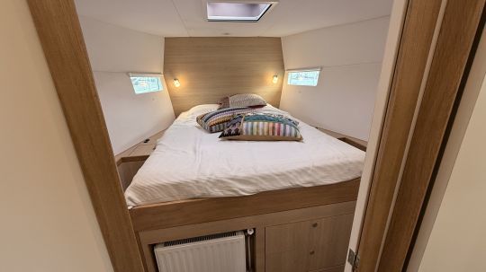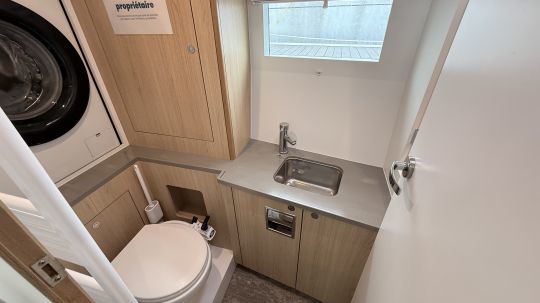 Each Isméria 45 can be customized, particularly in terms of interior woodwork. Although the layout is modular, the yacht we visited had 2 double cabins and a beautiful bathroom, which also houses the washing machine.