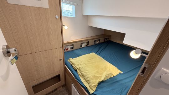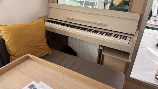 The living room is bright and flexible, with a functional kitchen (three gas rings, refrigerator with drawers, double sink, microwave on converter, 3kg washing machine). A fold-down table provides extra sleeping space. The sleeping area comprises two double cabins, one of which is forward, with plenty of storage space. A bathroom with separate shower completes the layout. An amusing feature is the piano at the rear of this very welcoming saloon.