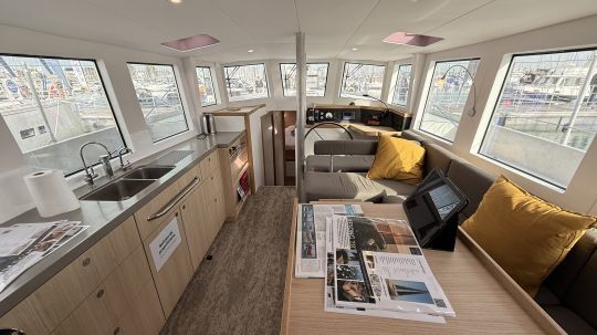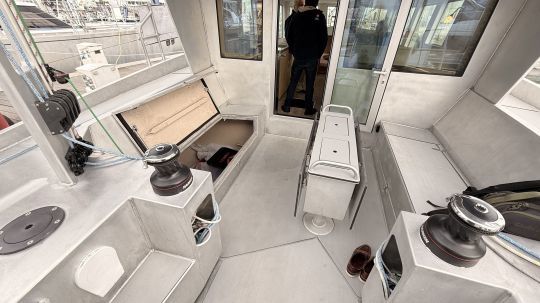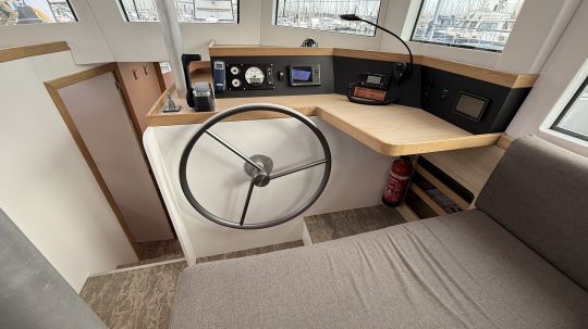 One of the special features of this yacht is the fluid flow between the cockpit and the interior living area, with no steep steps or descents. The "mono-maran" concept optimizes space and 360-degree visibility from inside, with large, vertical deckhouse windows. The interior helm station, integrated into the design of the deck saloon, allows helming from the shelter while maintaining visibility forward thanks to reversed windows. Surprisingly, the owners did not want an outside helm in the cockpit, but this is possible on request.