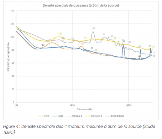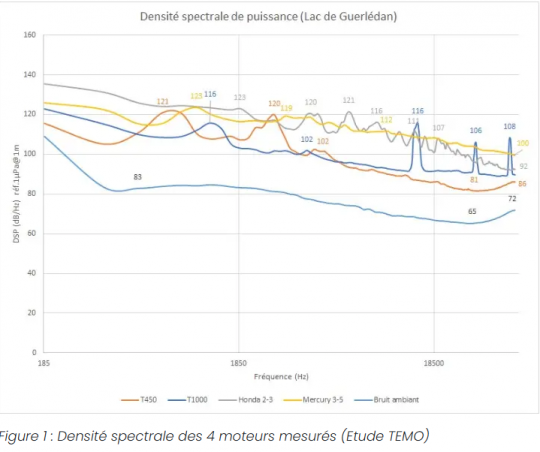 The tests were carried out in June 2024 on Lac de Guerlédan, between the Temo 450, the Temo 1000, and two 3 and 5 hp thermal outboards. Engineers and researchers recorded the sound emissions of several engines in operation, then analyzed the signals over a wide frequency range, from 180 hertz to 45 kilohertz. The measurements, which enabled sound pressure levels to be compared at identical speeds, are expressed in dB SPL re1?Pa@1m