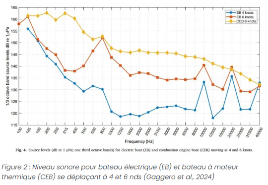 Two studies published in 2024 by Aradi et al. and Gaggero et al. confirm these trends. The differences observed between electric and internal combustion engines range from 5 to 15 dB SPL, depending on power and operating speed. Gaggero's Italian study also illustrates the difference in acoustic impact perimeters, which are smaller for electric boats, particularly for fish and dolphins.