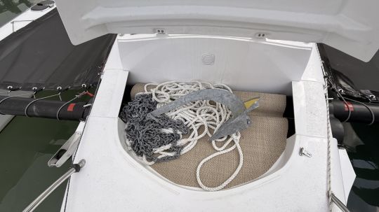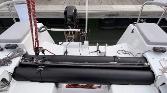 One of the strong points of this trimaran remains its float folding system. Mounted on telescopic aluminum arms, these allow two folded positions: one at 2.99 m (for stability in port) and one at 2.52 m for road transport. Each float, weighing around 110 kg, requires rope-assisted maneuvering for extension and retraction. However, once the boat is in the water, it remains accessible to two people. The boat can thus be stored at home or launched on conventional slipways.
