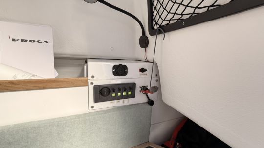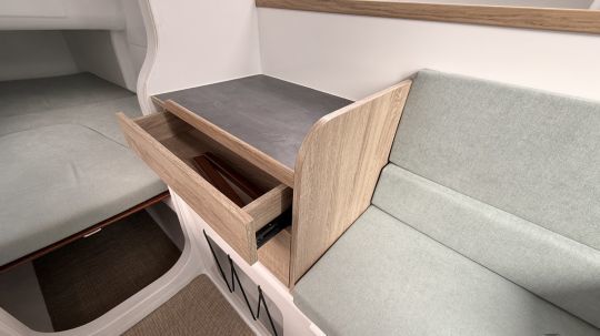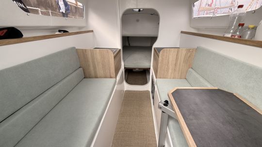 The interior volume of the 26.5 represents a significant step forward in the range. The canvas-separated forward cabin features a double berth measuring 1.40 m at the head, narrowed to 1 m at the foot. The saloon, with a headroom of 1.80 m, includes two side benches that can be transformed into 60 cm-wide berths (the berths can be extended into the passageway for the night). The interior equipment remains basic: a sink, a small stove, fresh water and a toilet area under the front bunk. This configuration is clearly aimed at outings lasting a few days on coastal waters, while maintaining a minimum of comfort for a family of four.
