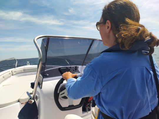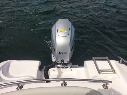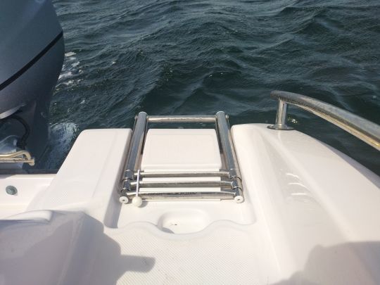 At the stern, the cockpit offers great depth, secured by generous freeboards. This uncluttered, robust space is the heart of the boat's use, whether as a fishing station, relaxation area or access platform to the sea. The rear bench seat incorporates a large storage compartment for batteries and circuit breaker. Access is simple and the interior finish, though rough, is clean and neat. A stainless-steel bathing ladder, fixed to the starboard platform, makes it easy to climb back aboard, complemented by an optional freshwater shower.