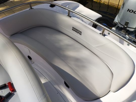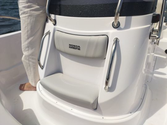 Honda's clear, modern instrumentation is limited to the essentials: tachometer, trim and speed indicators, PR70 multifunction display, and accessible battery switch. On the port side, a few switches control the navigation lights and automatic bilge pump. In this way, the cockpit retains its functional spirit, without visual overload.