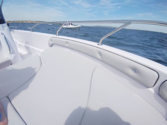 Construction is in reinforced polyester, with a constant focus on rigidity and lightness. The deck layout, molded in a single piece, bears witness to the Calabrian shipyard's expertise. The finish is clean, the joints neat, and the stratification of high quality, in line with the standards of much more expensive boats.