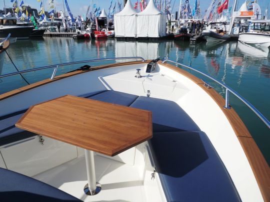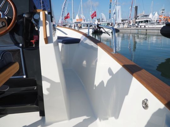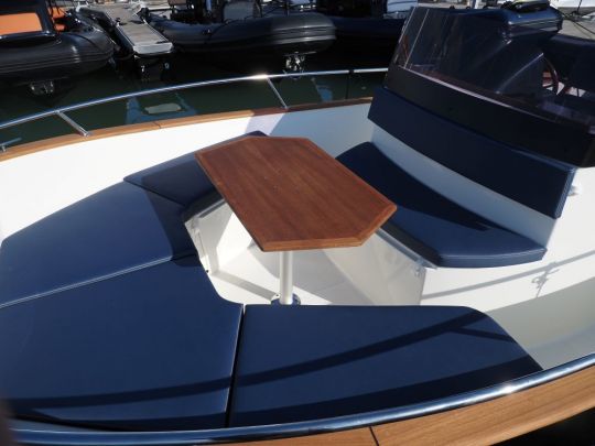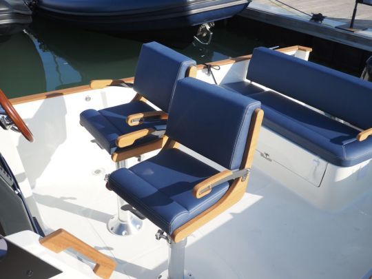 Aesthetically, the 23 Origine takes up the brand's visual codes: dark blue hull, wooden gunwales (iroko) and simple upholstery in water-repellent fabric. The whole is coherent, without overloading. There's a deck saloon forward with removable table, a central space with two adjustable helm seats, and a triple bench seat aft.